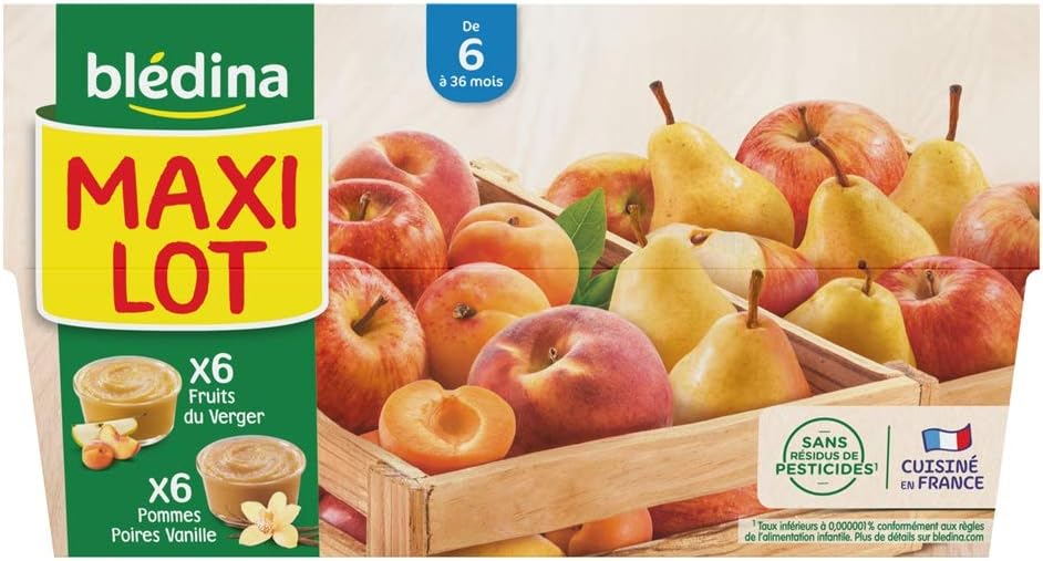 Pommes 59,9 % - Poires 40,0 % - Arôme naturel de vanille - Jus de citron concentré* - Vitamine C - * présence en fonction de l'acidité des fruits - Blédina Coupelles 6x100g Fruits du verger Dès 6mois : Pommes 49,0 % - Poires 24,0 % - Pêches 16,0 % - Abricots 11,0 % - Vitamine C - Jus de citron concentré* - * présence en fonction de l'acidité des fruits
