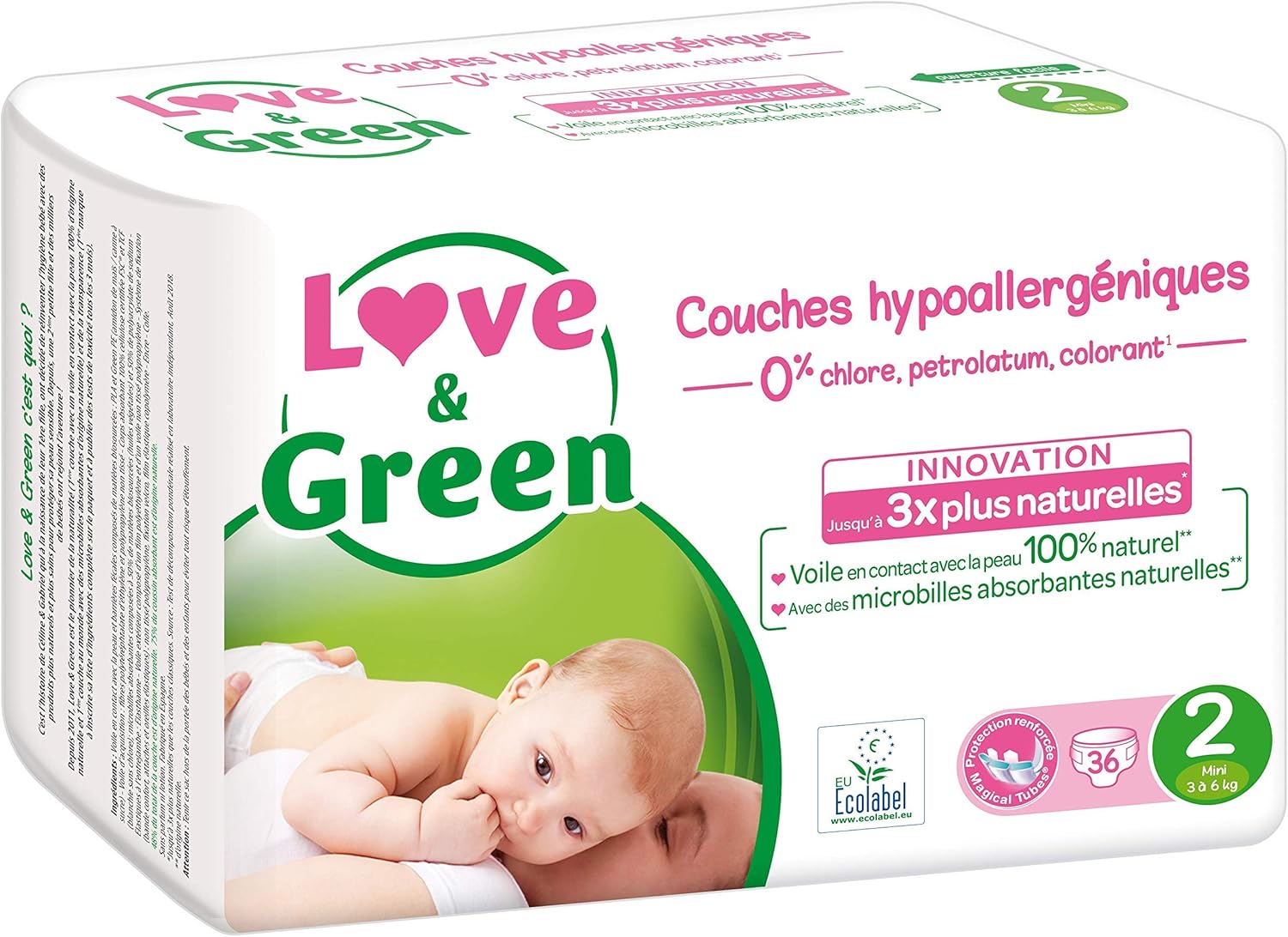 Love & Green - Couches Bébé Hypoallergéniques 0% - Taille 2 (3-6 kg) - 36 couches