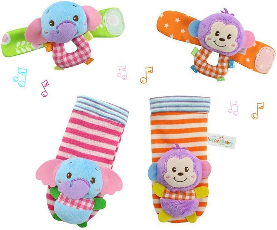 YeahiBaby 4pcs poignet hochets pour bébés mains bébé Animal de ressuage Finders peluches développementale (singe et Elephant)
