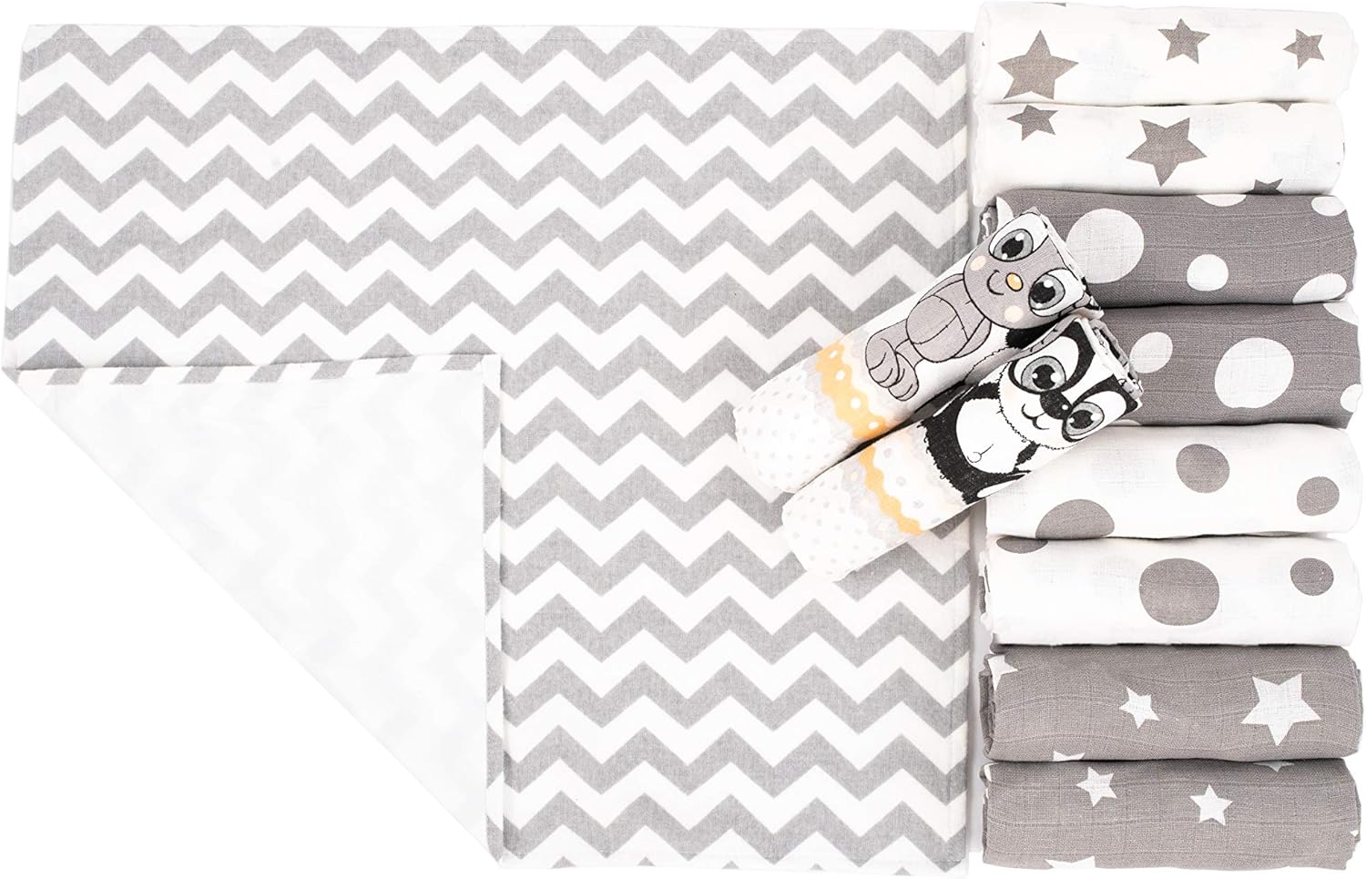 💗 INFO SUR LANGES EN MOUSSELINE ET MATELAS À LANGER - Cet ensemble contient 10 pièces de mousseline carrées de 80x80 cm chacune. Il y a 2 x blanches, 2 x étoiles grises, 2 x points blancs, 2 x points gris et 2 x animaux mignons. Le matelas à langer en flanelle mesure 50 x 60 cm. Il est recouvert d'une membrane PEVA imperméable et peut être utilisé jusqu'à 40 degrés Celsius - veuillez ne pas sécher au sèche-linge