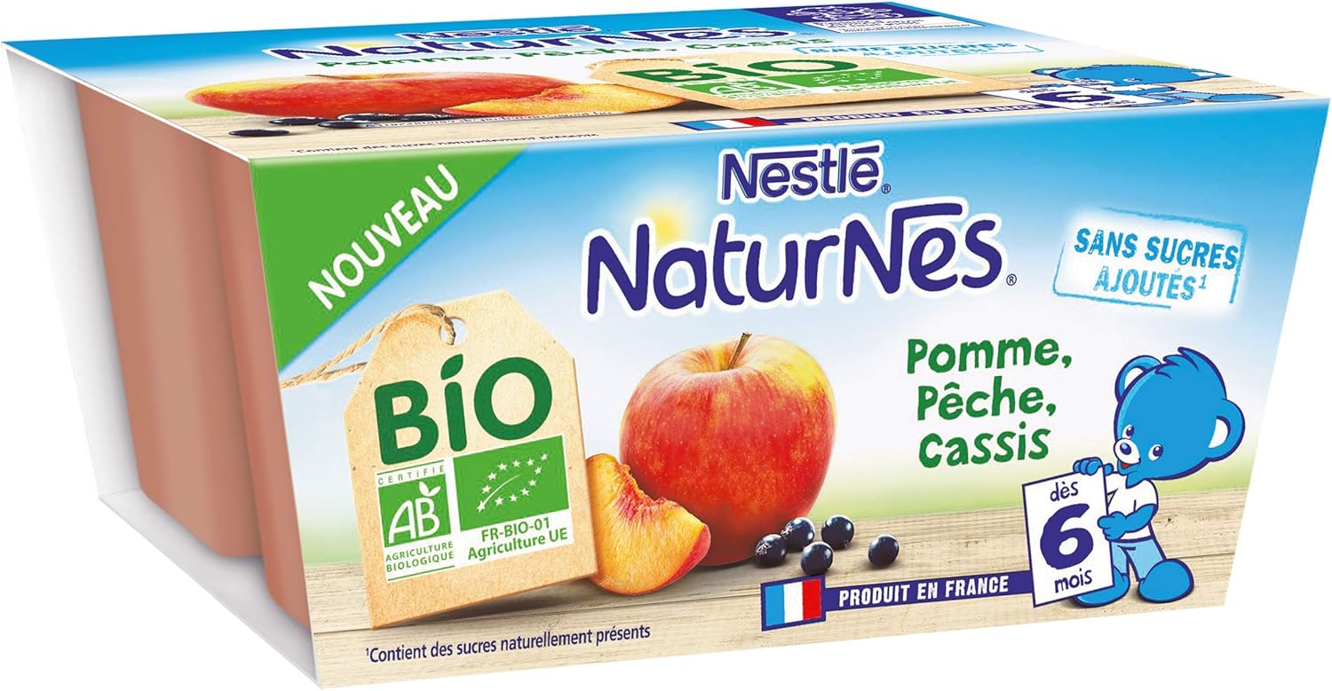 Nestlé Naturnes BIO - Compotes bébé Pomme, Pêche, Cassis - Dès 6 mois - 4x90g